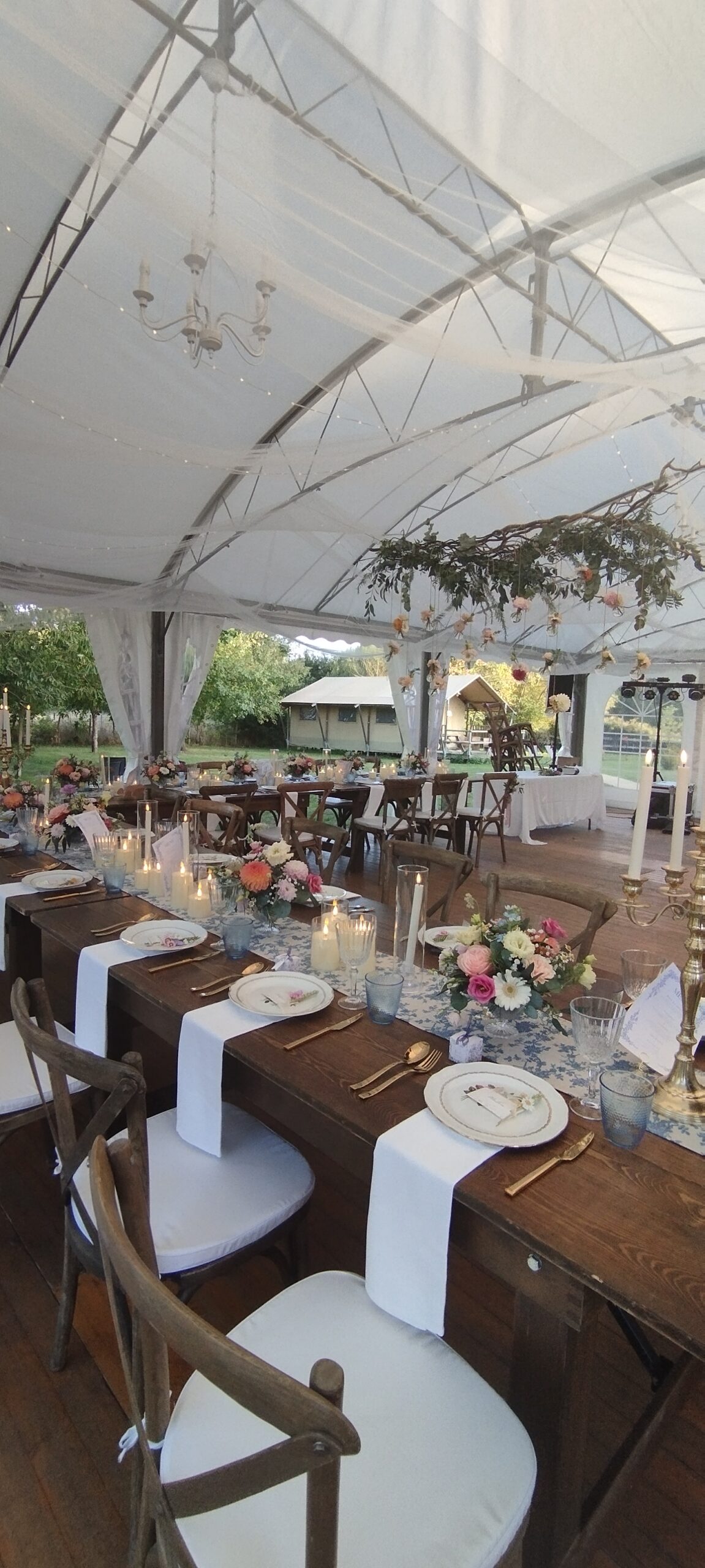 À l’extérieur, le charme opère immédiatement : un grand barnum et une grange de 90 m² au cachet authentique offrent des ambiances uniques, à imaginer et à décorer selon vos envies, pour un mariage champêtre, bohème ou délicatement vintage.